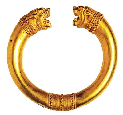 在古代伊朗文化中,環(huán)形因形似太陽,是密特拉信仰主神的象征,被賦予存在、原初、創(chuàng)世與永恒等含義。獨(dú)立展柜中陳列著一枚公元前2世紀(jì)的青銅授權(quán)環(huán)。授權(quán)環(huán)又稱“權(quán)力之環(huán)”,象征著權(quán)力的授予,授權(quán)時(shí)雙方各從一端握住它。展覽海報(bào)上的黃金獅首授權(quán)環(huán),為阿契美尼德王朝(公元前550年—公元前330年)的代表文物。