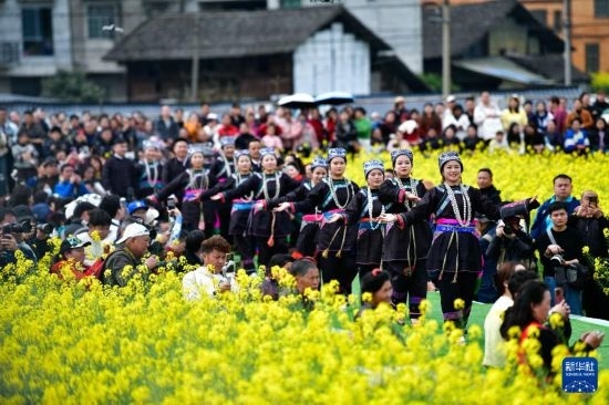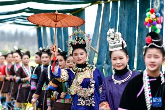 3月16日,在貴州省榕江縣車江大壩,村民們穿著民族盛裝參加花田走秀。