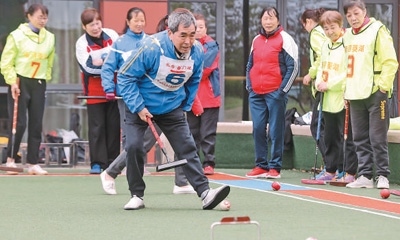 浙江省湖州市德清縣市民活動中心,老年門球愛好者在揮桿競技。