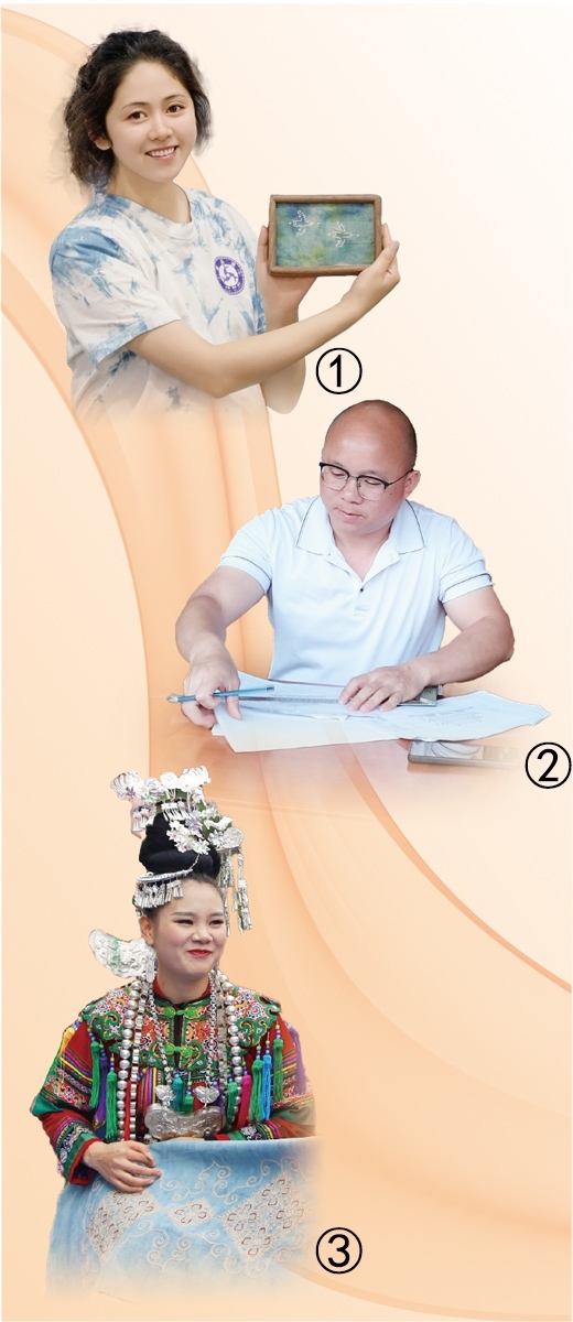 圖①:陸江磊展示蠟染刺繡擺件產(chǎn)品。