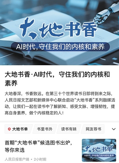 習(xí)近平總書記在今年全國兩會(huì)期間的重要講話中指出“書香是一種氛圍”“數(shù)字閱讀要和傳統(tǒng)閱讀結(jié)合起來,守住我們的內(nèi)核和素養(yǎng)”。在第三十個(gè)世界讀書日即將到來之際,人民日報(bào)社文藝部和新媒體中心聯(lián)合啟動(dòng)“大地書香”系列融媒活動(dòng),并圍繞“AI時(shí)代,守住我們的內(nèi)核和素養(yǎng)”推出首期“大地書單”。來自出版、文藝、科技、教育等不同領(lǐng)域的20位薦書人,推薦出35本候選圖書,在人民日報(bào)客戶端“大地書香”專題予以集中呈現(xiàn),參照網(wǎng)友的評(píng)論與推薦,最終推選出10本上榜圖書。讓我們多讀書、讀好書,一起在氤氳著書香的大地上行穩(wěn)致遠(yuǎn)。