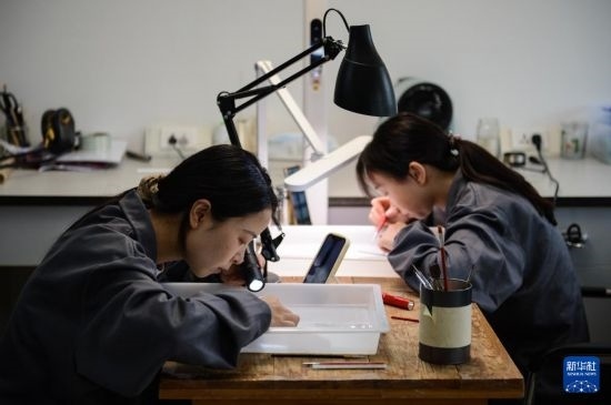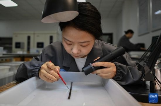 4月24日,荊州文物保護(hù)中心簡牘工作室工作人員在清理竹簡。新華社記者 程敏 攝