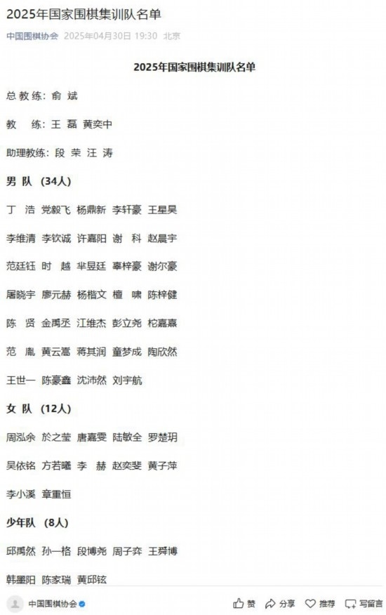 據(jù)國家圍棋集訓隊選拔小組負責人介紹,根據(jù)《國家圍棋集訓隊運動員入隊標準》,報中國圍棋協(xié)會批準,共有54人入選2025屆國家集訓隊。男隊由王星昊、丁浩、黨毅飛、楊鼎新、李軒豪、李維清、李欽誠等34名棋手組成;女隊有12人,包括周泓余、於之瑩、唐嘉雯等。此外,國少隊還有8名棋手。國家圍棋集訓隊的教練組由5人組成,俞斌擔任總教練,王磊、黃奕中擔任教練,段榮和汪濤任助理教練。