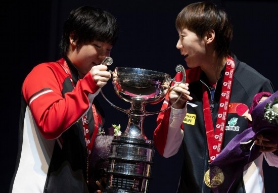 5月25日,冠軍中國組合王曼昱/蒯曼(左)在頒獎儀式上。當(dāng)日,在卡塔爾多哈舉行的2025世界乒乓球錦標(biāo)賽女子雙打決賽中,中國組合王曼昱/蒯曼3比0戰(zhàn)勝波爾卡諾娃(奧地利)/斯佐科斯(羅馬尼亞)組合,奪得冠軍。新華社記者 肖藝九 攝
