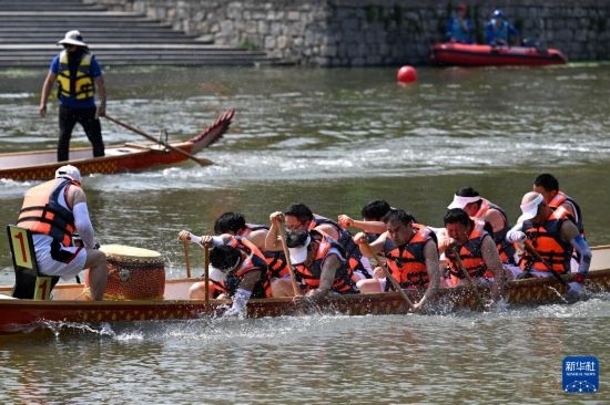 5月30日,在安徽省蚌埠市五河縣,參賽隊伍在進(jìn)行龍舟比賽。