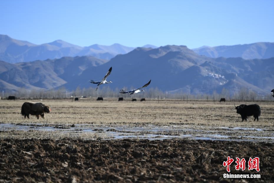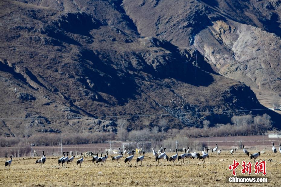 12月20日,黑頸鶴在西藏拉薩市林周縣虎頭山水庫(kù)周邊的冬灌地里棲息。嚴(yán)冬時(shí)節(jié),拉薩河谷沿線(xiàn)的草甸、山巒、候鳥(niǎo)、寺廟構(gòu)成一道獨(dú)特的風(fēng)景線(xiàn)。 中新社記者 貢嘎來(lái)松 攝