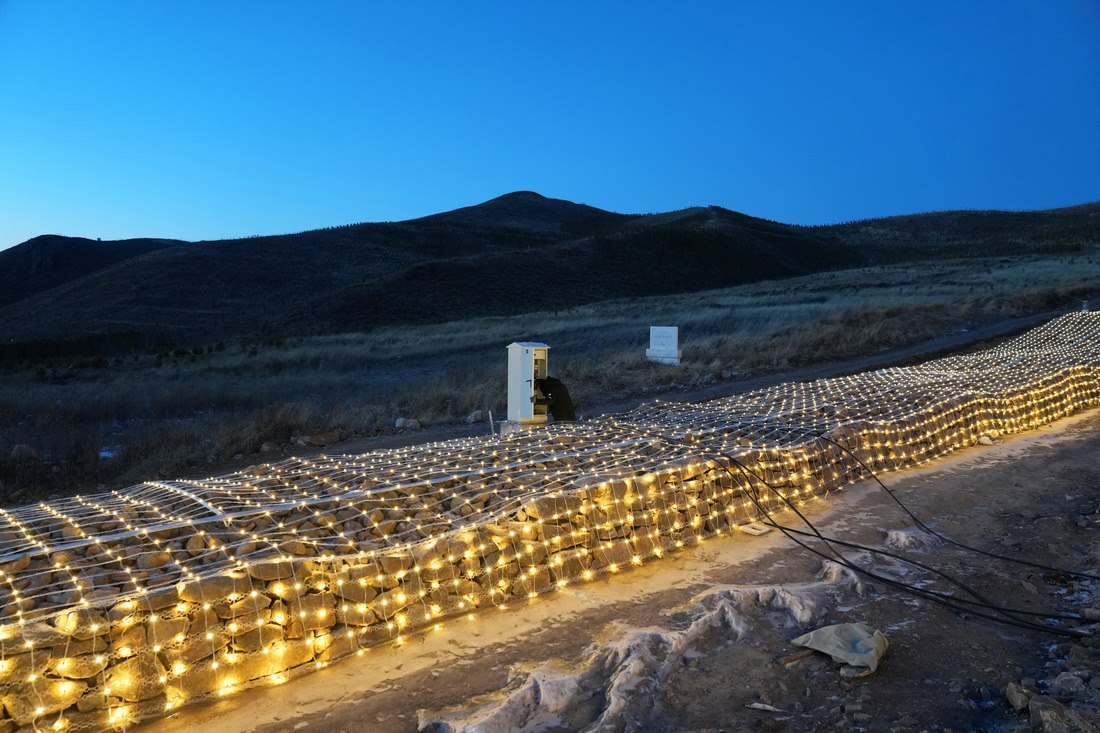 12月30日,工作人員在崇禮長城景觀展示亮化工程現(xiàn)場檢查燈帶。新華社記者 牟宇 攝