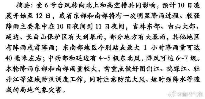 央視網(wǎng)消息:據(jù)@吉林氣象 微博消息,受第6號(hào)臺(tái)風(fēng)“卡努”轉(zhuǎn)向北上和高空槽共同影響,預(yù)計(jì)10日凌晨開始至12日,吉林省東部和南部將有一次明顯的降雨過(guò)程。較強(qiáng)降雨主要集中在10日夜間到11日夜間,吉林市東部、白山市大部、延邊州、長(zhǎng)白山保護(hù)區(qū)有大到暴雨,部分地方有大暴雨,其他地區(qū)有陣雨或雷陣雨;東南部地區(qū)個(gè)別站點(diǎn)最大1小時(shí)降雨量可達(dá)40毫米左右;中西部和延邊州有4~5級(jí)東北風(fēng),陣風(fēng)可達(dá)6~7級(jí)。本輪降雨?yáng)|部和南部雨量較大,氣象部門提醒,需重點(diǎn)做好圖們江、鴨綠江、牡丹江等流域防汛調(diào)度工作,同時(shí)注意防范大風(fēng)、短時(shí)強(qiáng)降水造成的局地氣象災(zāi)害。