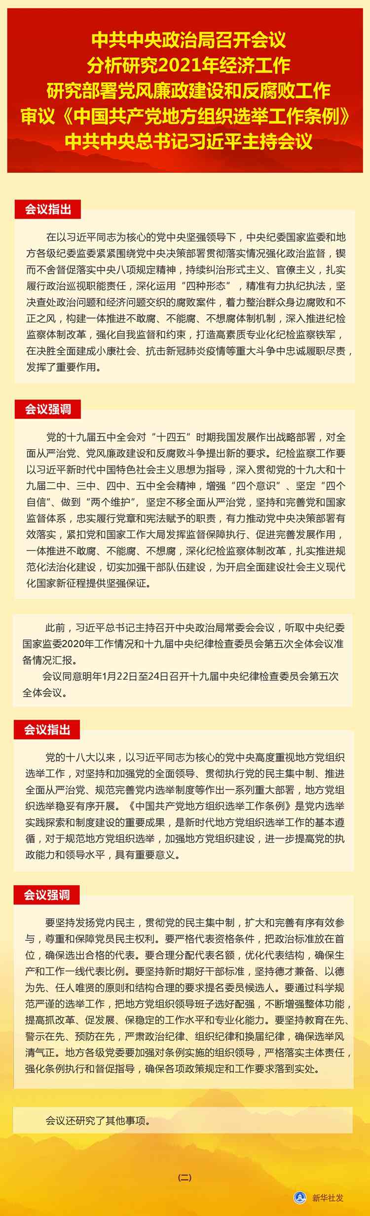 新華社北京12月11日電 中共中央政治局12月11日召開(kāi)會(huì)議,分析研究2021年經(jīng)濟(jì)工作;聽(tīng)取中央紀(jì)委國(guó)家監(jiān)委工作匯報(bào),研究部署2021年黨風(fēng)廉政建設(shè)和反腐敗工作;審議《中國(guó)共產(chǎn)黨地方組織選舉工作條例》。中共中央總書記習(xí)近平主持會(huì)議。