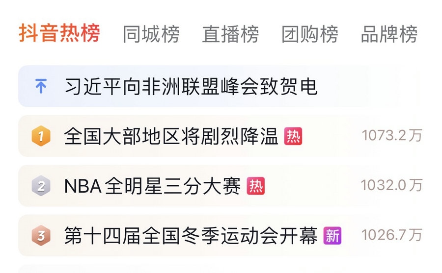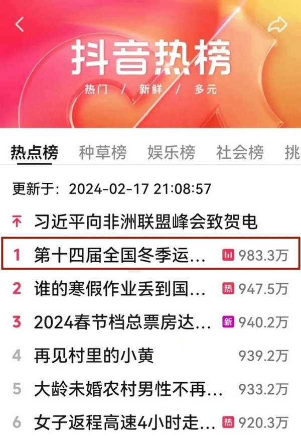當(dāng)晚,無與倫比、震撼人心的開幕式登上抖音熱榜第一名,截至18日中午,依然是熱榜前三名。
