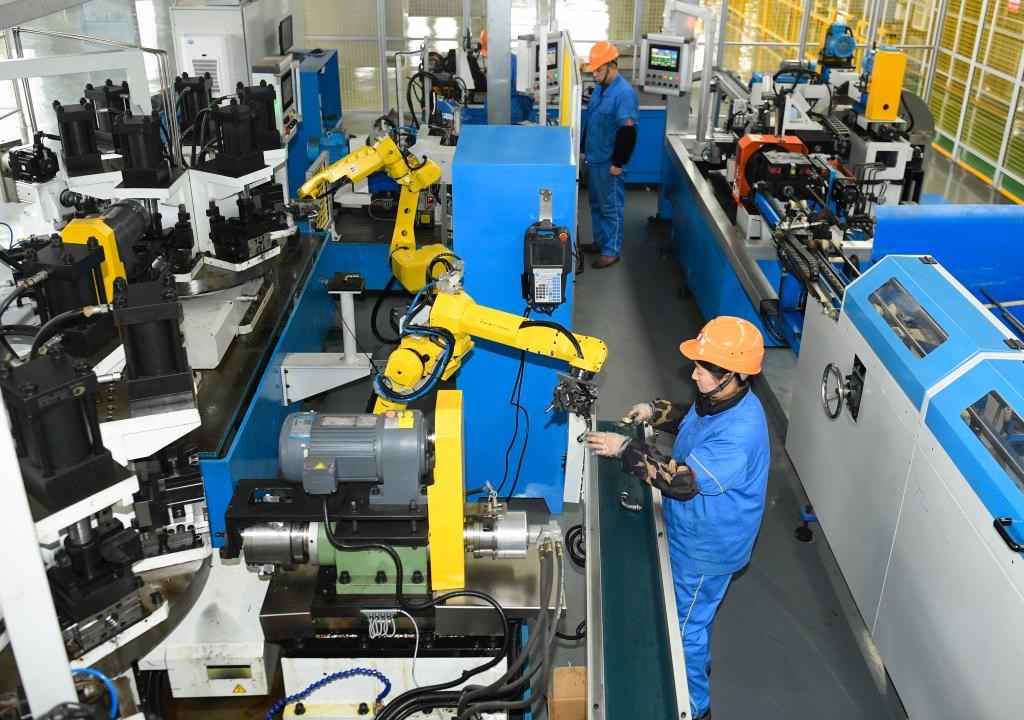 2月14日,浙江省湖州市吳興區(qū)的一家企業(yè),工作人員和智能機器人協(xié)作生產(chǎn)不銹鋼管件。新華社記者 翁忻旸 攝