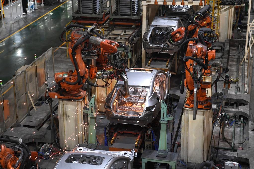工業(yè)機器人在江淮汽車乘用車焊接車間生產(chǎn)線上工作(2月22日攝)。新華社記者 劉軍喜 攝