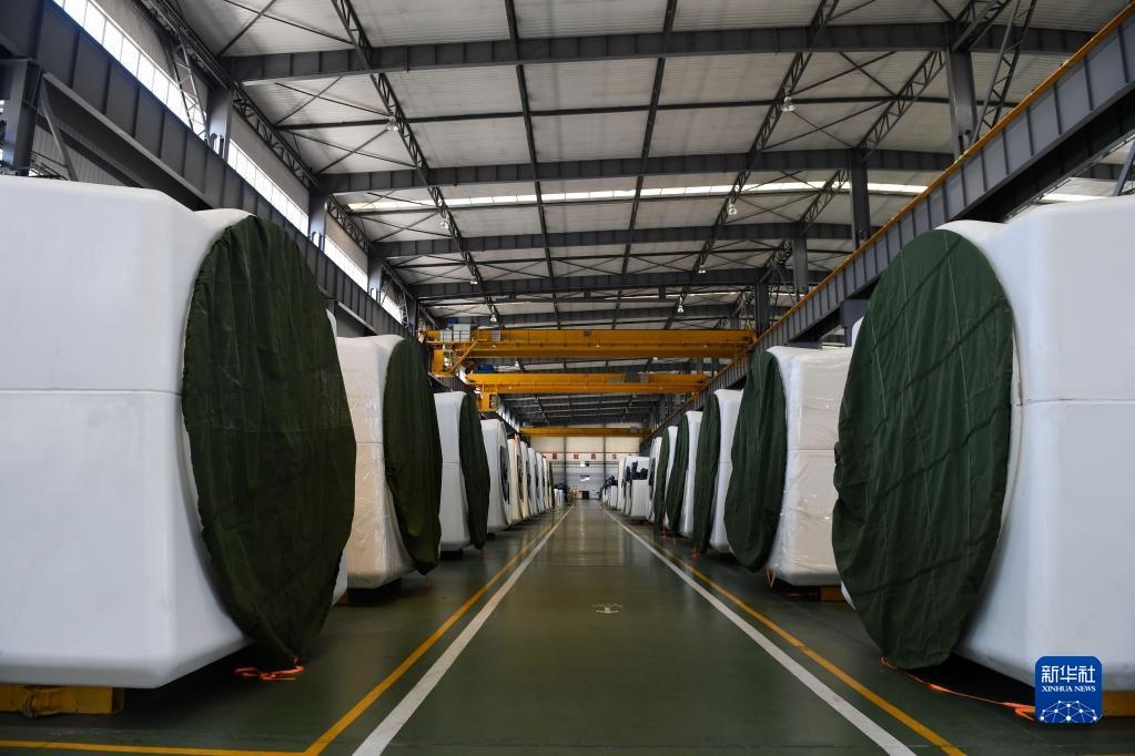 這是在內蒙古鄂爾多斯市一家能源裝備有限公司生產車間拍攝的準備出售的風電機(2018年4月18日攝)。新華社記者 劉磊 攝