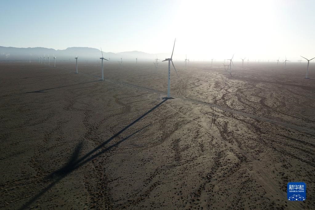 這是2021年12月8日拍攝的中節(jié)能(甘肅)風力發(fā)電有限公司玉門昌馬風電場的風機(無人機照片)。新華社記者 范培珅 攝
