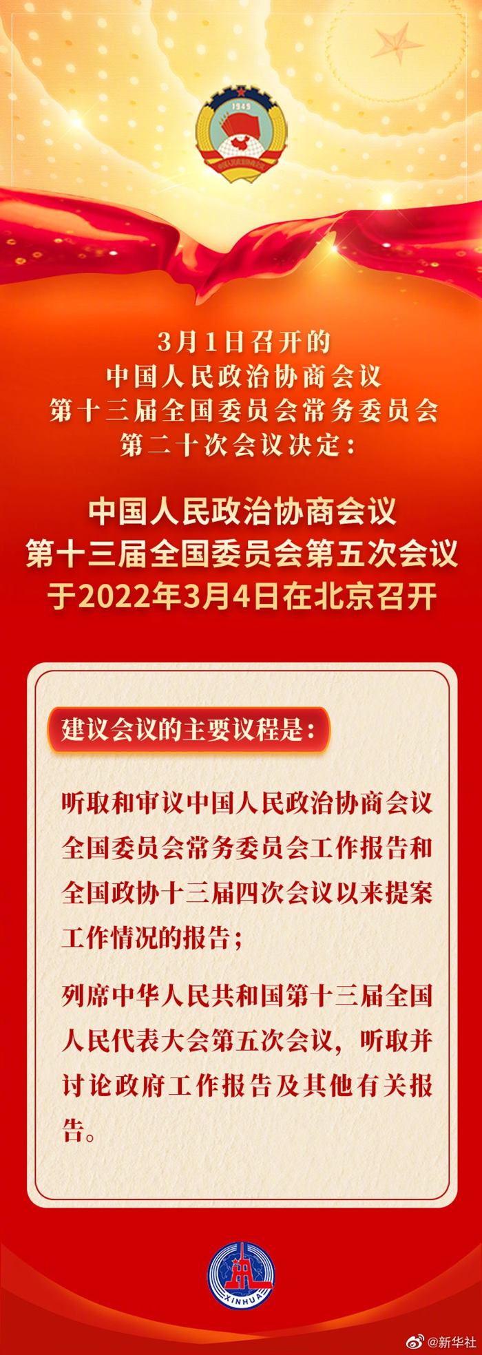 3月1日召開(kāi)的中國(guó)人民政治協(xié)商會(huì)議第十三屆全國(guó)委員會(huì)常務(wù)委員會(huì)第二十次會(huì)議決定:中國(guó)人民政治協(xié)商會(huì)議第十三屆全國(guó)委員會(huì)第五次會(huì)議于2022年3月4日在北京召開(kāi)。建議會(huì)議的主要議程是:聽(tīng)取和審議中國(guó)人民政治協(xié)商會(huì)議全國(guó)委員會(huì)常務(wù)委員會(huì)工作報(bào)告和全國(guó)政協(xié)十三屆四次會(huì)議以來(lái)提案工作情況的報(bào)告;列席中華人民共和國(guó)第十三屆全國(guó)人民代表大會(huì)第五次會(huì)議,聽(tīng)取并討論政府工作報(bào)告及其他有關(guān)報(bào)告。