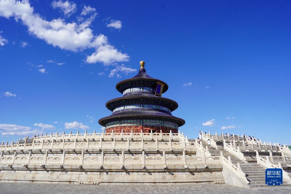 這是藍(lán)天白云下的北京天壇祈年殿(2021年6月4日攝)。
