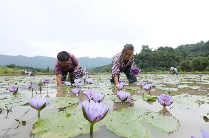 2022年6月28日,在貴州省赤水市寶源鄉(xiāng)玉豐村,村民在采摘香水蓮花。近年來,貴州省赤水市寶源鄉(xiāng)采取“黨支部+合作社+農(nóng)戶”模式,引導(dǎo)農(nóng)民種植集觀賞、藥用、食用為一體的香水蓮花,帶動農(nóng)民增收,助力鄉(xiāng)村振興。新華社發(fā)(王長育 攝)