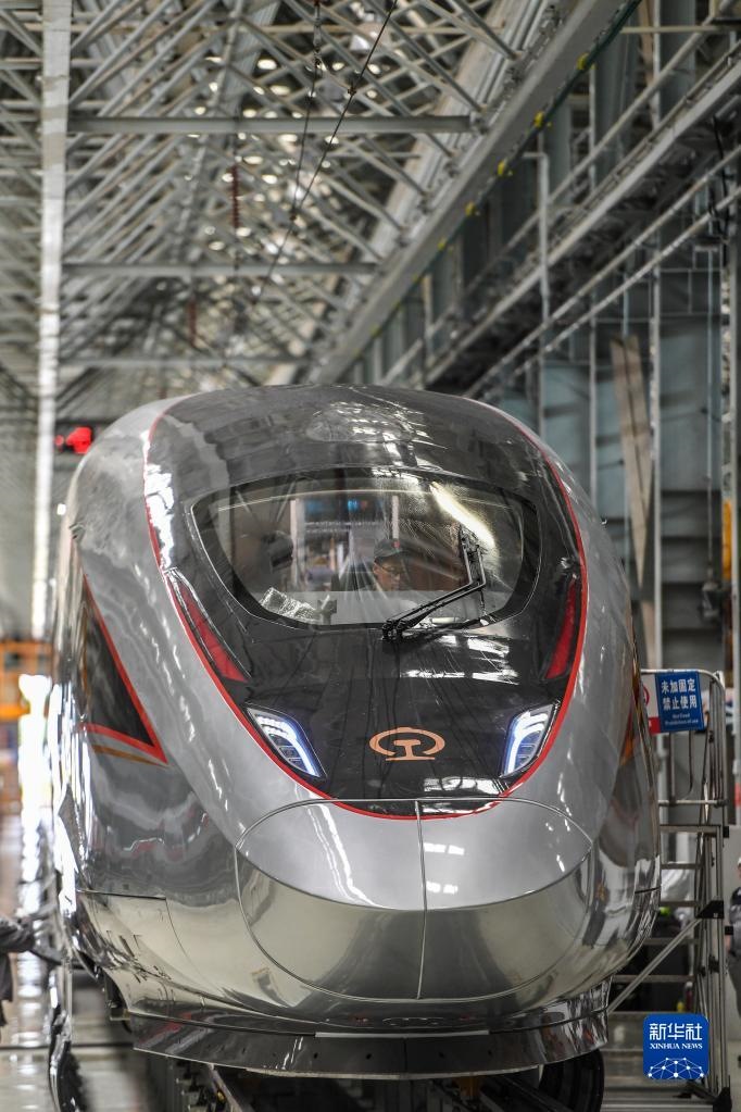 2021年6月15日在中車長客高速動(dòng)車組制造中心拍攝的復(fù)興號智能動(dòng)車組。新華社記者 張楠 攝