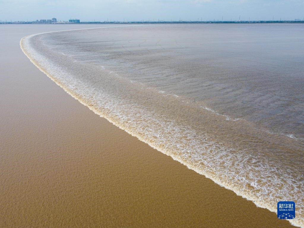 這是在杭州市錢塘新區(qū)拍攝的錢塘江一線潮奇觀(2020年10月5日攝,無人機照片)。新華社記者 江漢 攝