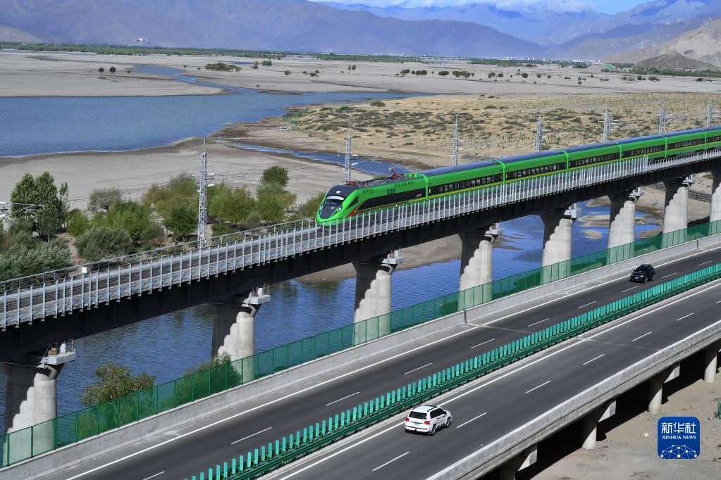 試運(yùn)行的復(fù)興號列車行駛在雅魯藏布江畔(2021年6月16日攝)。新華社記者 覺果 攝