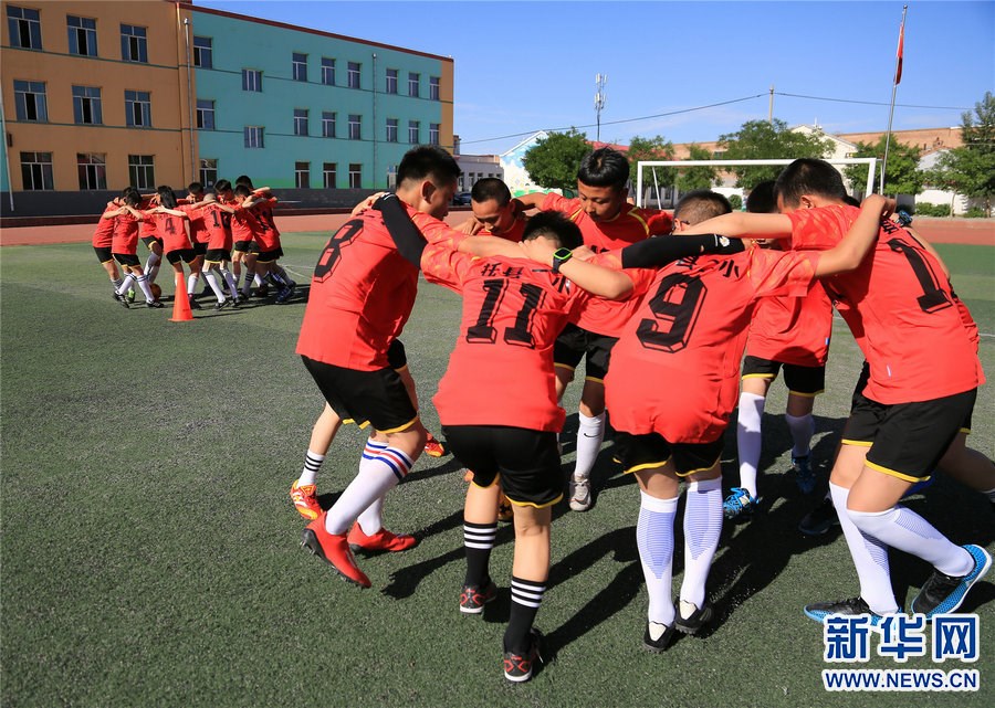 6月15日,內(nèi)蒙古自治區(qū)呼和浩特市托克托縣第二小學(xué)學(xué)生在足球課上進(jìn)行賽前熱身。新華網(wǎng)發(fā)(馬斌攝) 托克托縣第二小學(xué)是國(guó)家級(jí)校園足球特色學(xué)校,學(xué)校已在4—6年級(jí)開(kāi)設(shè)了足球課。