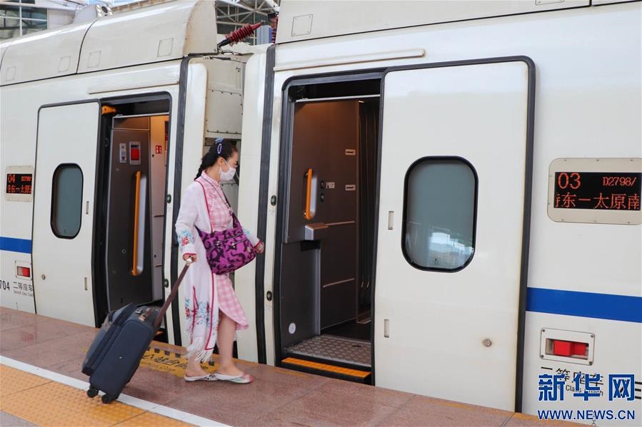 7月1日,在呼和浩特東火車站,鐵路工作人員在D2798次“和諧號”動車組列車旁合影留念。 自7月1日起,內(nèi)蒙古呼和浩特與山西太原間首次開行動車組列車,動車組列車每日開行2對,兩地間客運(yùn)鐵路運(yùn)行時間由過去的近10小時縮短至最快5小時以內(nèi)。 新華社記者 朱文哲 攝